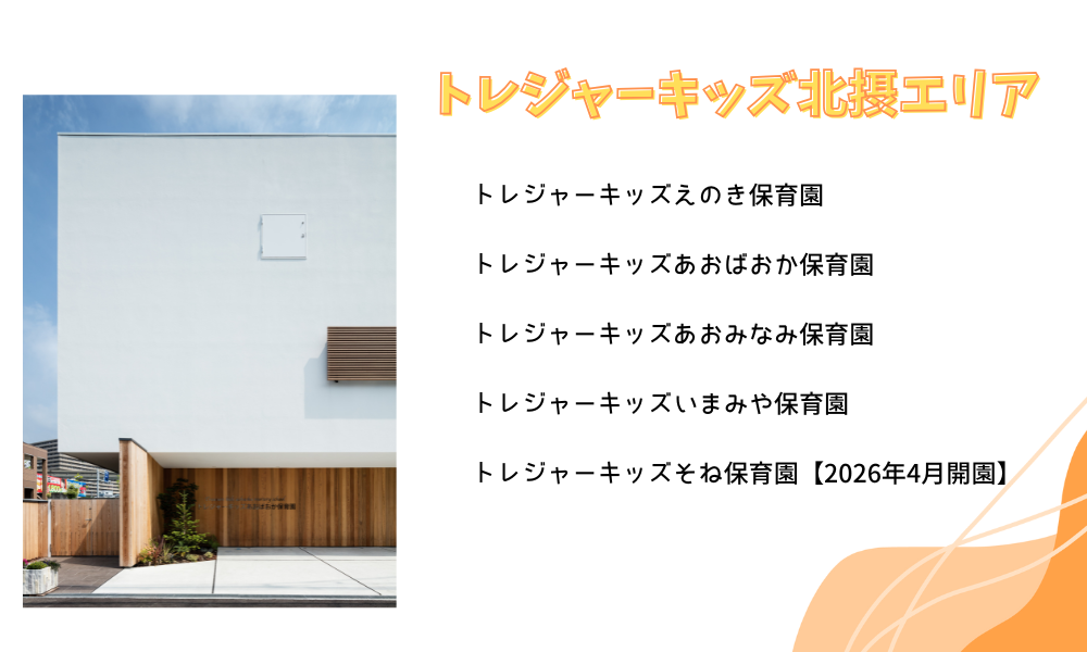 | 住所 | トレジャーキッズえのき保育園 大阪府吹田市江の木町14-10 トレジャーキッズあおばおか保育園 大阪府吹田市青葉丘北7-26 トレジャーキッズあおみなみ保育園 大阪府箕面市彩都粟生南2-12-22 トレジャーキッズいまみや保育園 大阪府箕面市今宮3丁目8-2 トレジャーキッズそね保育園【2026年4月開園】 大阪府豊中市曽根西町1-93 |